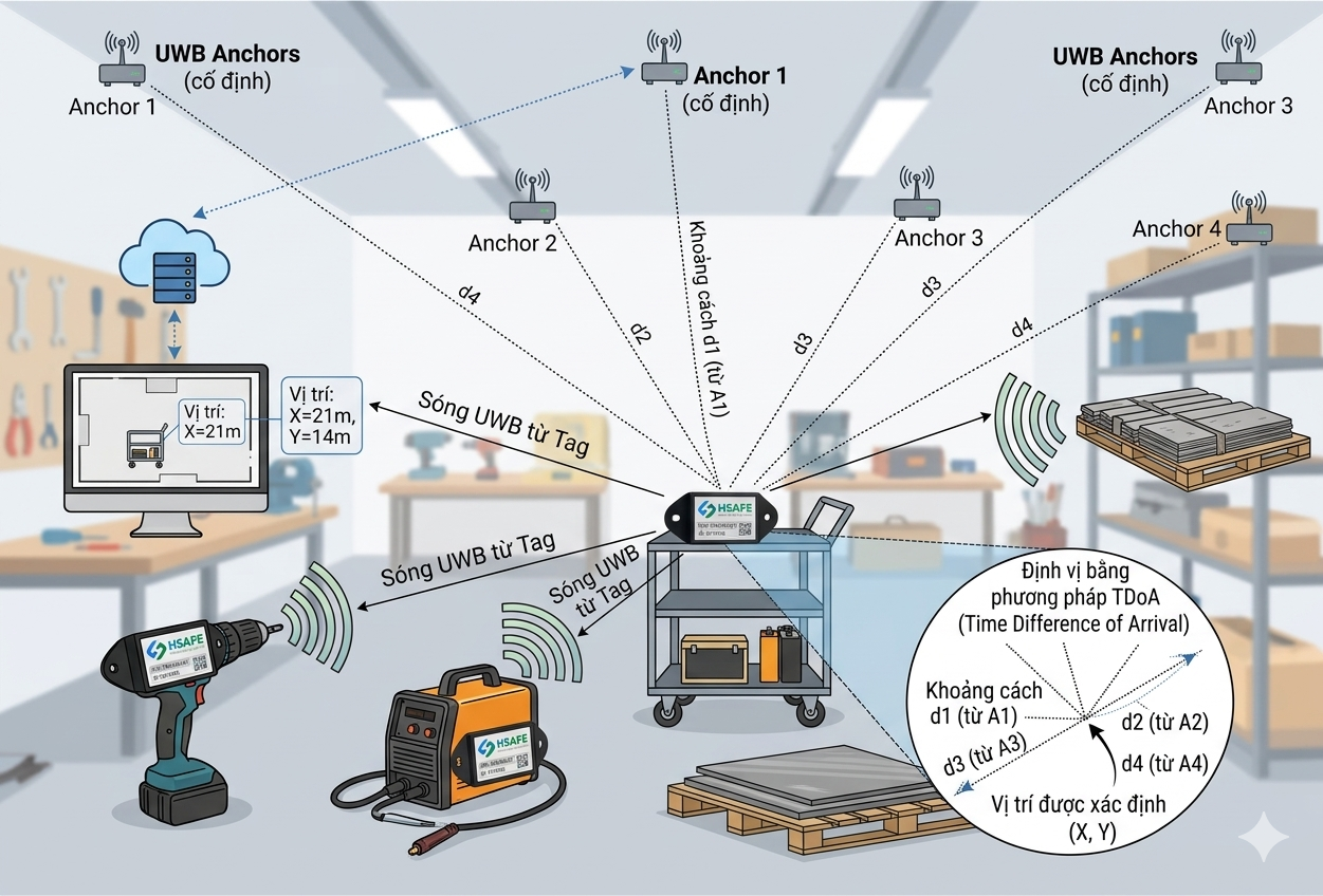 Ultra-Wideband (UWB) technology provides high positioning accuracy (down to centimeters) even in environments with many obstacles, metal structures, or dust — far superior to conventional RFID or Bluetooth technologies. The server aggregates data from multiple Anchors to calculate the precise location and compares it with pre-defined restricted or permitted zones (geofence).